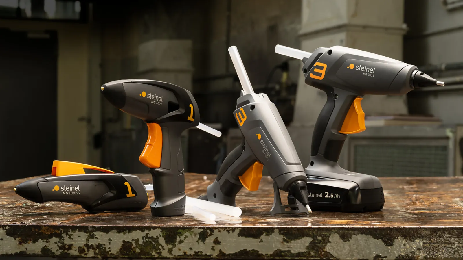 Pachetul de livrare: MG 3011, 3x bețișoare de lipici de 11 mm, baterie 18V 2,5AH PFA* și încărcător PFA* (*doar pentru varianta cu baterie)